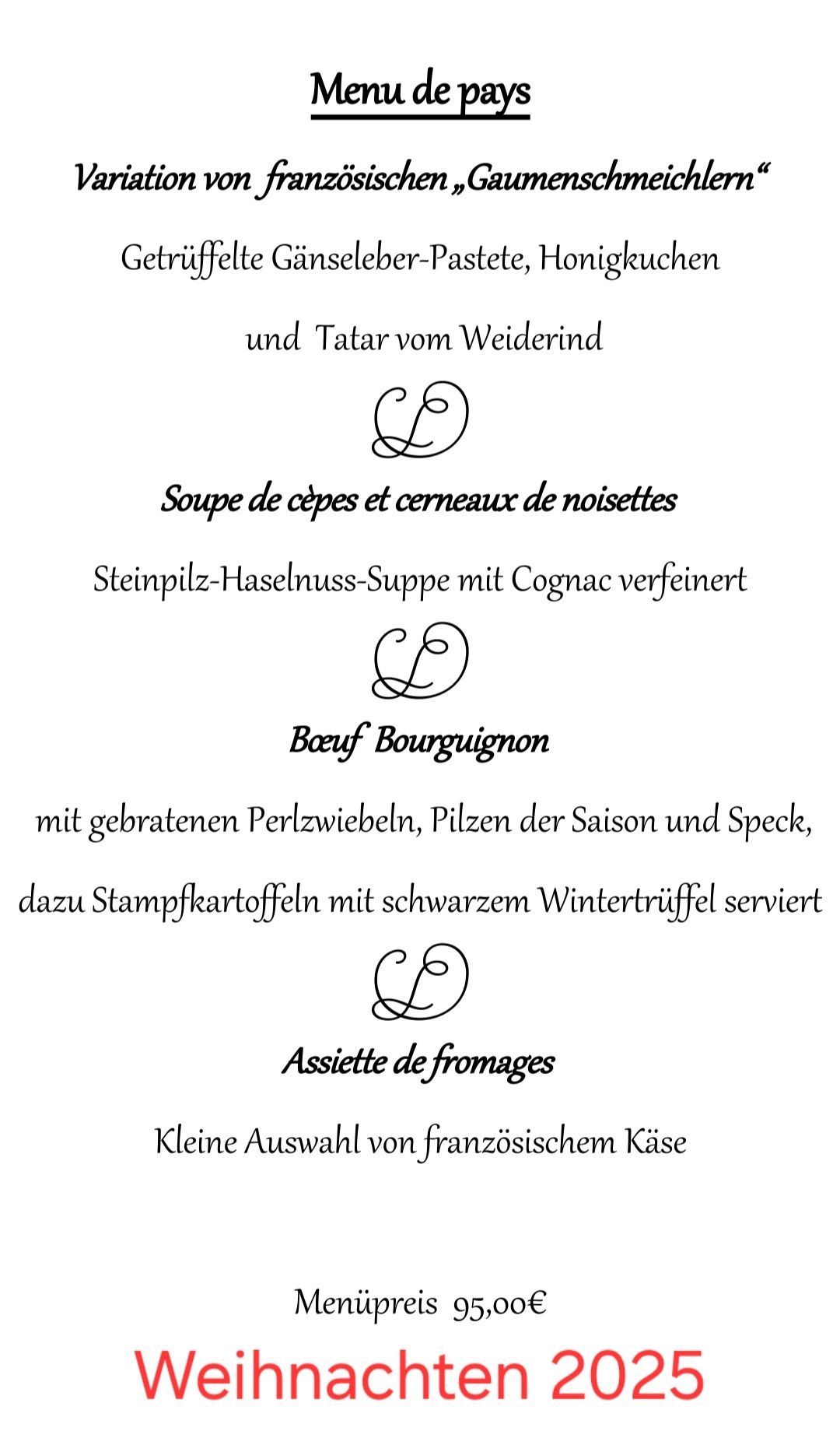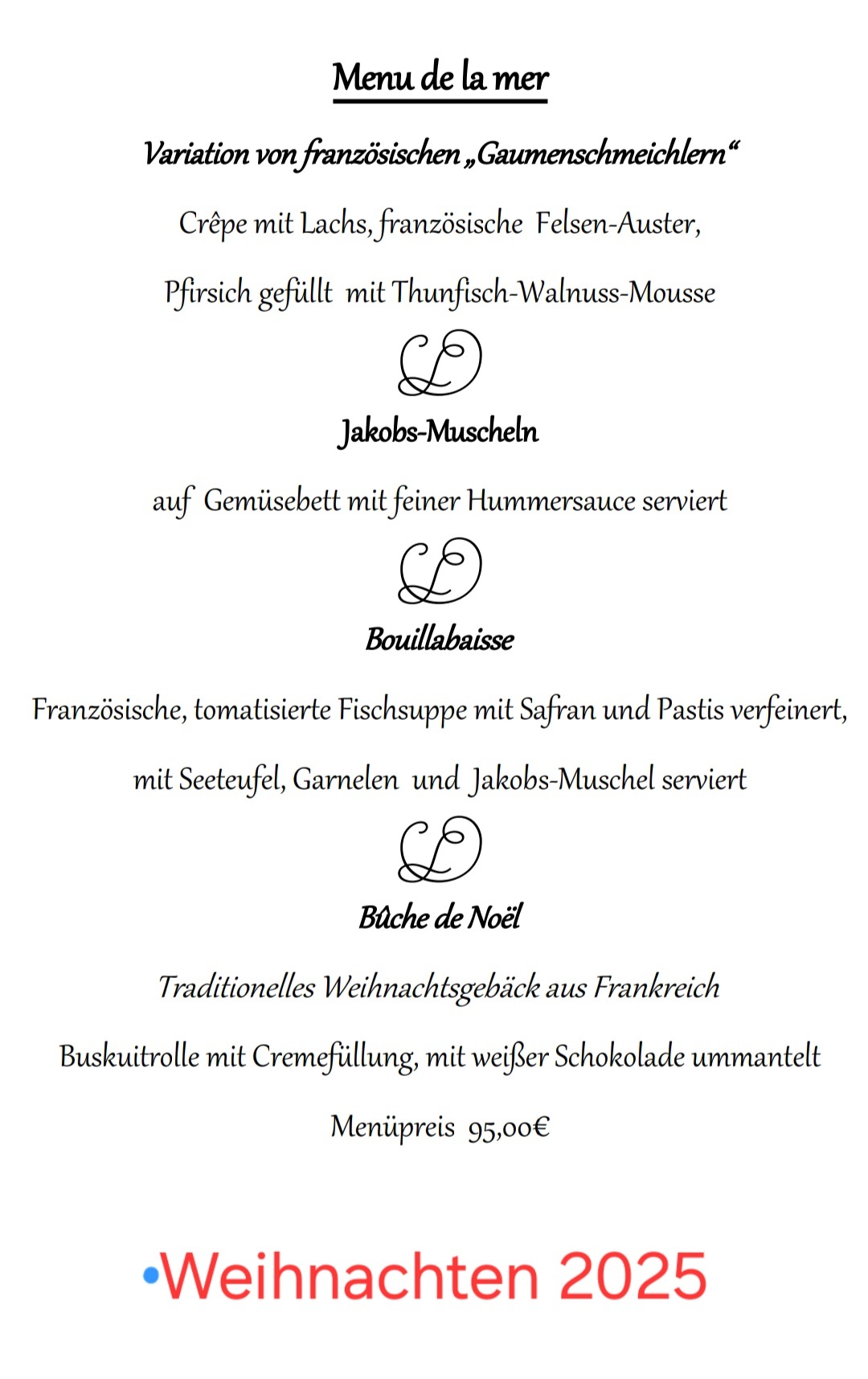 Weihnachtsmenü nach Anmeldung 25/12/2025 – 26/12/2025 |